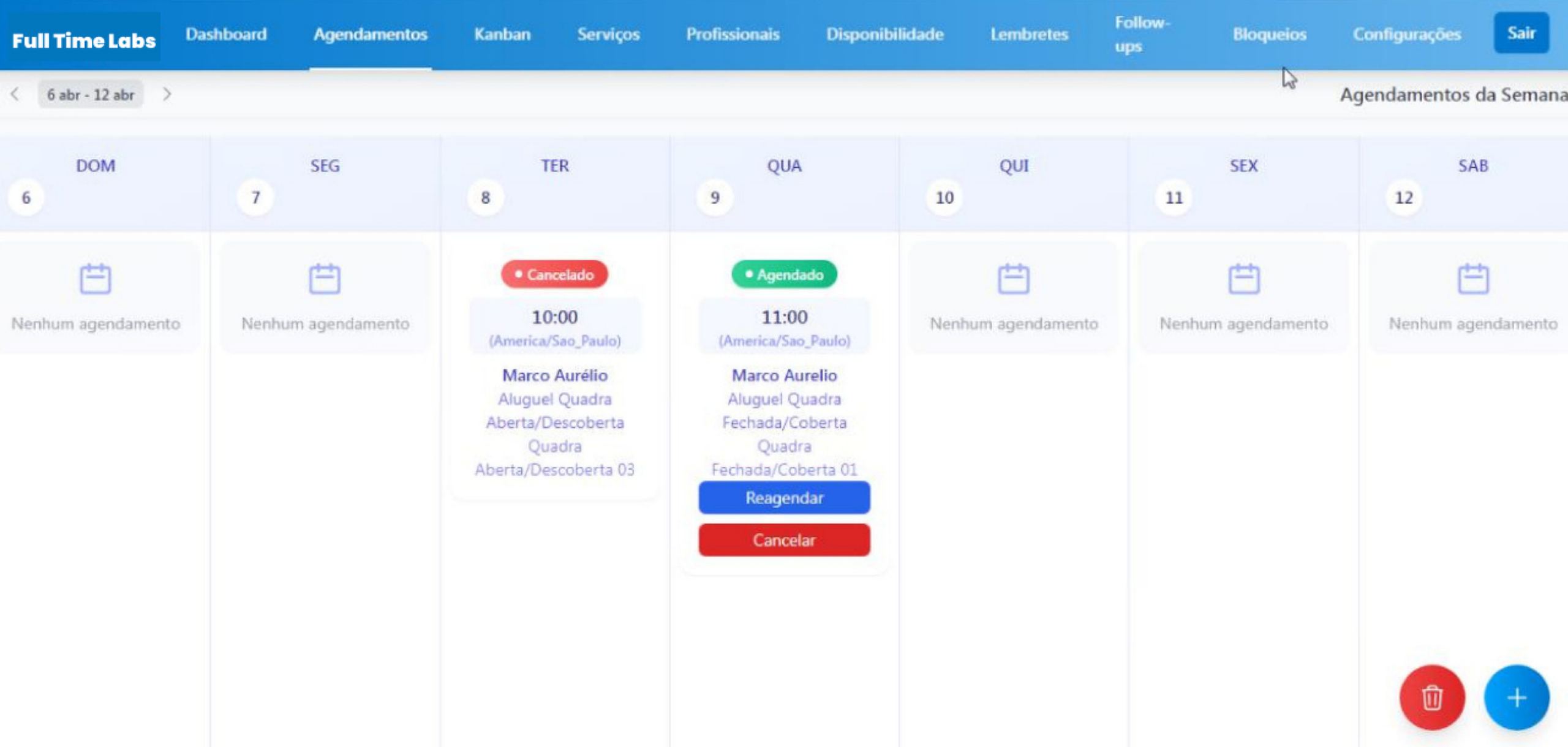 Gerenciar os agendamentos do seu negócio nunca foi tão fácil! Com o Painel de Agendamento da FullSports, você tem uma visão completa e detalhada de todos os horários e reservas — tudo em um só lugar, de forma rápida e intuitiva.