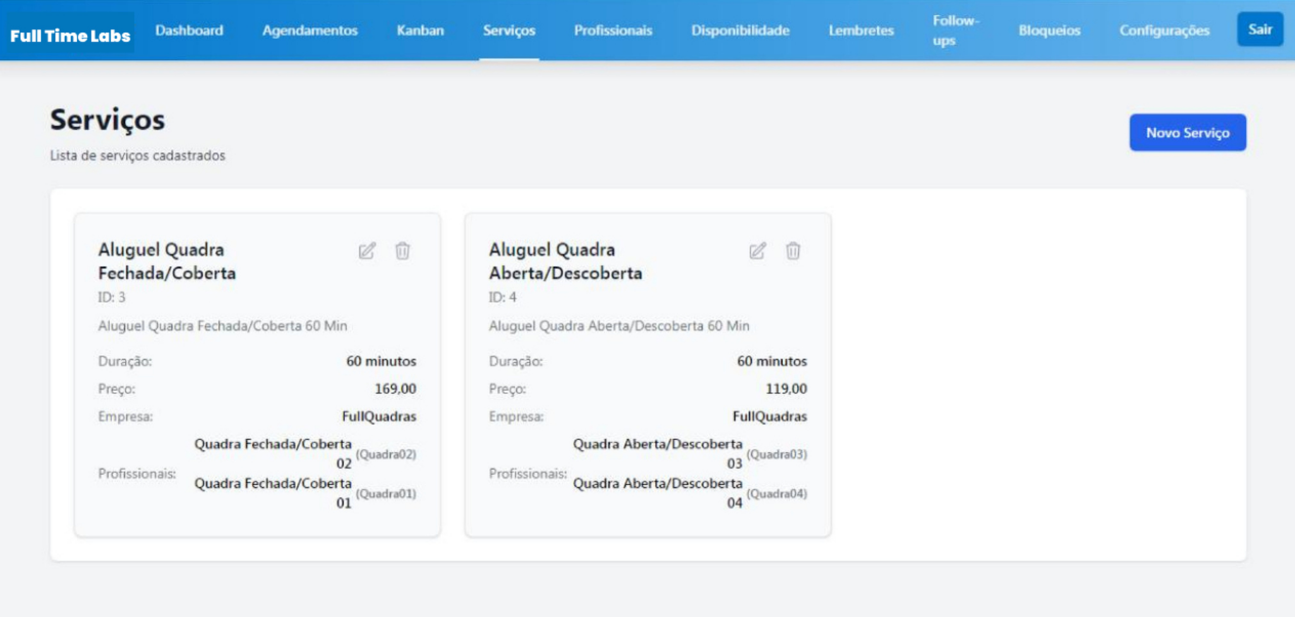 Com a ferramenta de Agendamento com IA da FullSports, você tem total liberdade para configurar diferentes Tipos de Serviços, adaptando o sistema às necessidades específicas do seu negócio e dos seus clientes.